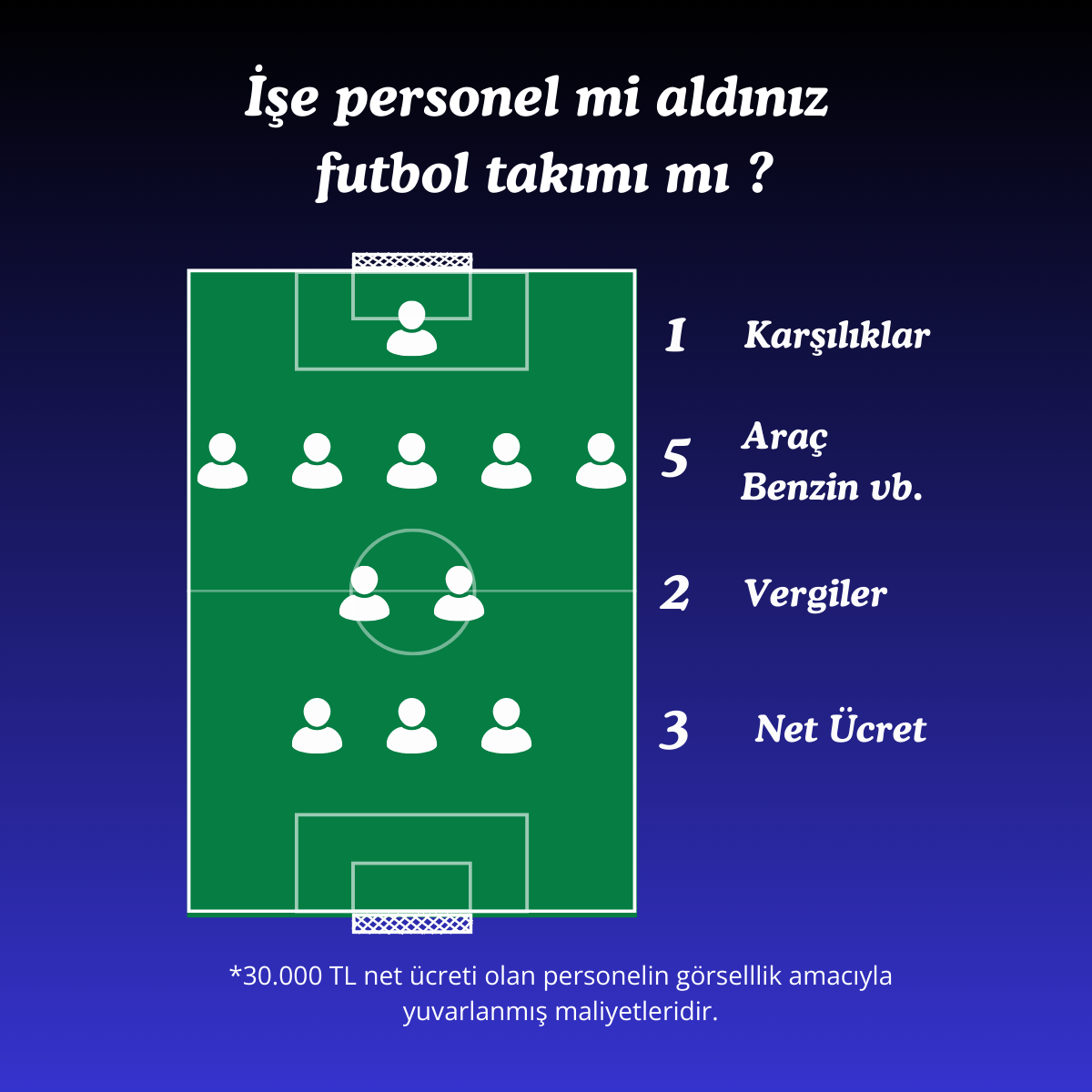 To summarize; when calculating sales team’s costs, a staff you pay 3 units as a net salary; you need to allocate a budget of 11 units, which is the number of players in a football team, including 2 units of tax, 5 units of other expenses and 1 unit of provisions .